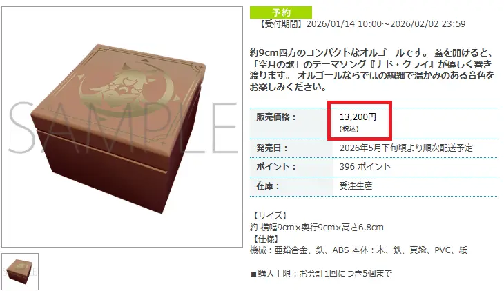 【商品說明】:這款小巧的音樂盒尺寸約為9公分見方。打開盒蓋,即可聆聽《空月之歌》的主題曲《Nad Klai》挪德卡萊。盡情享受只有音樂盒才能奏出的細膩溫暖的樂音吧。