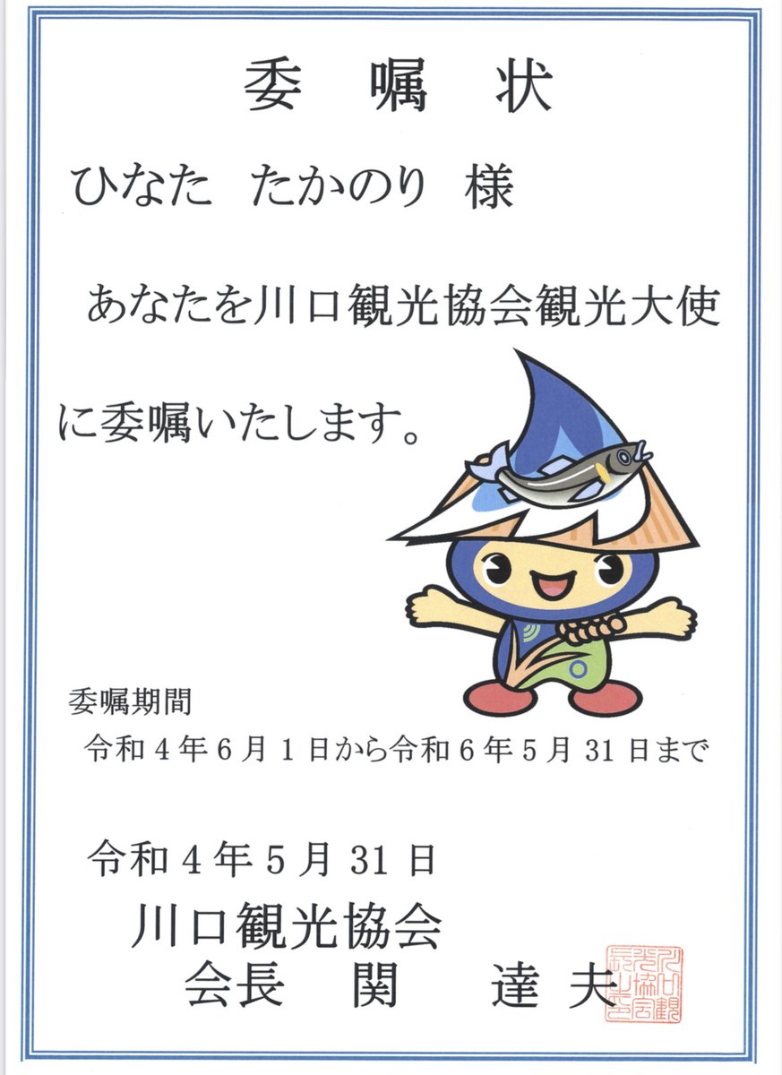 今天、以2022年6月1日為起點,ひなた被任命為『川口觀光協