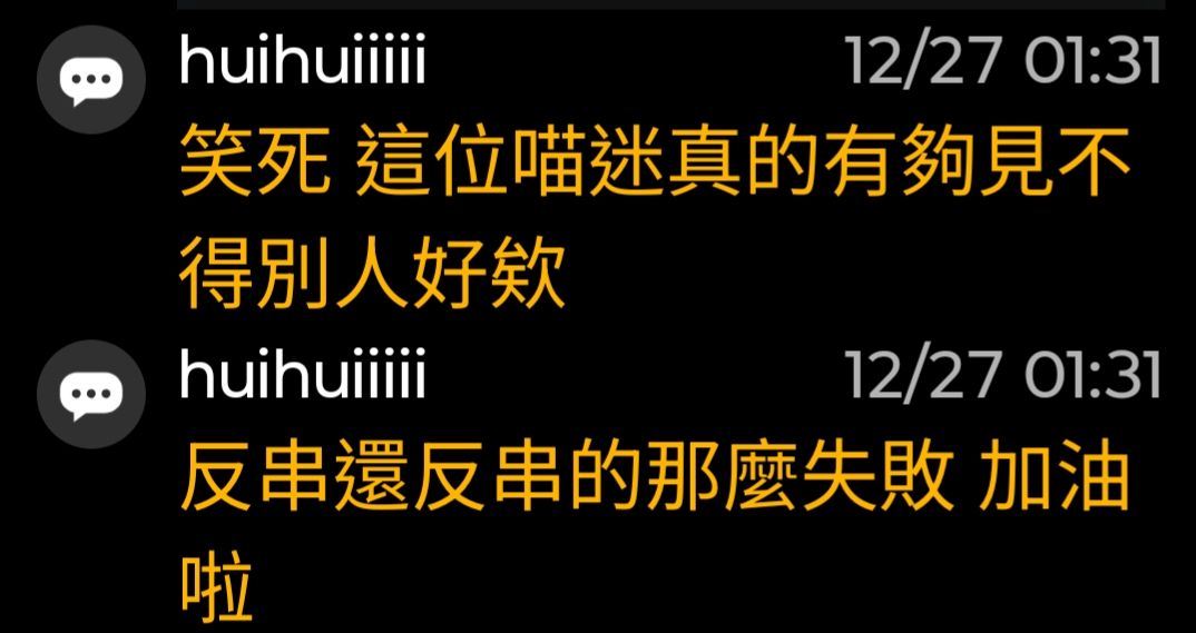 → huihuiiiii: 且後續的留言沒有講可悲喵迷就代表 12/27 13:44