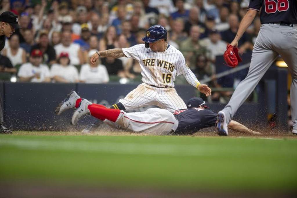 釀酒人寇頓王(球衣16號)滑回本壘,國民一壘手齊瑪曼觸殺不及。(美聯社)