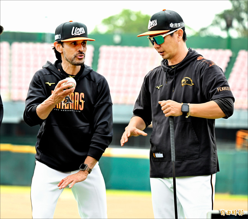 美籍客座教練卡諾獅(左)協助獅隊提升年輕捕手能力。(記者林正堃攝)