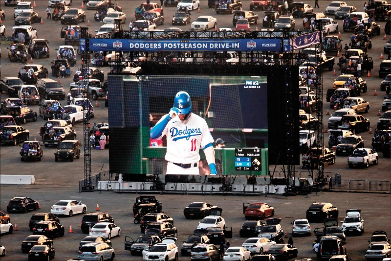 道奇在停車場設置大型螢幕,讓球迷在車上觀看世界大賽(歐新社)
