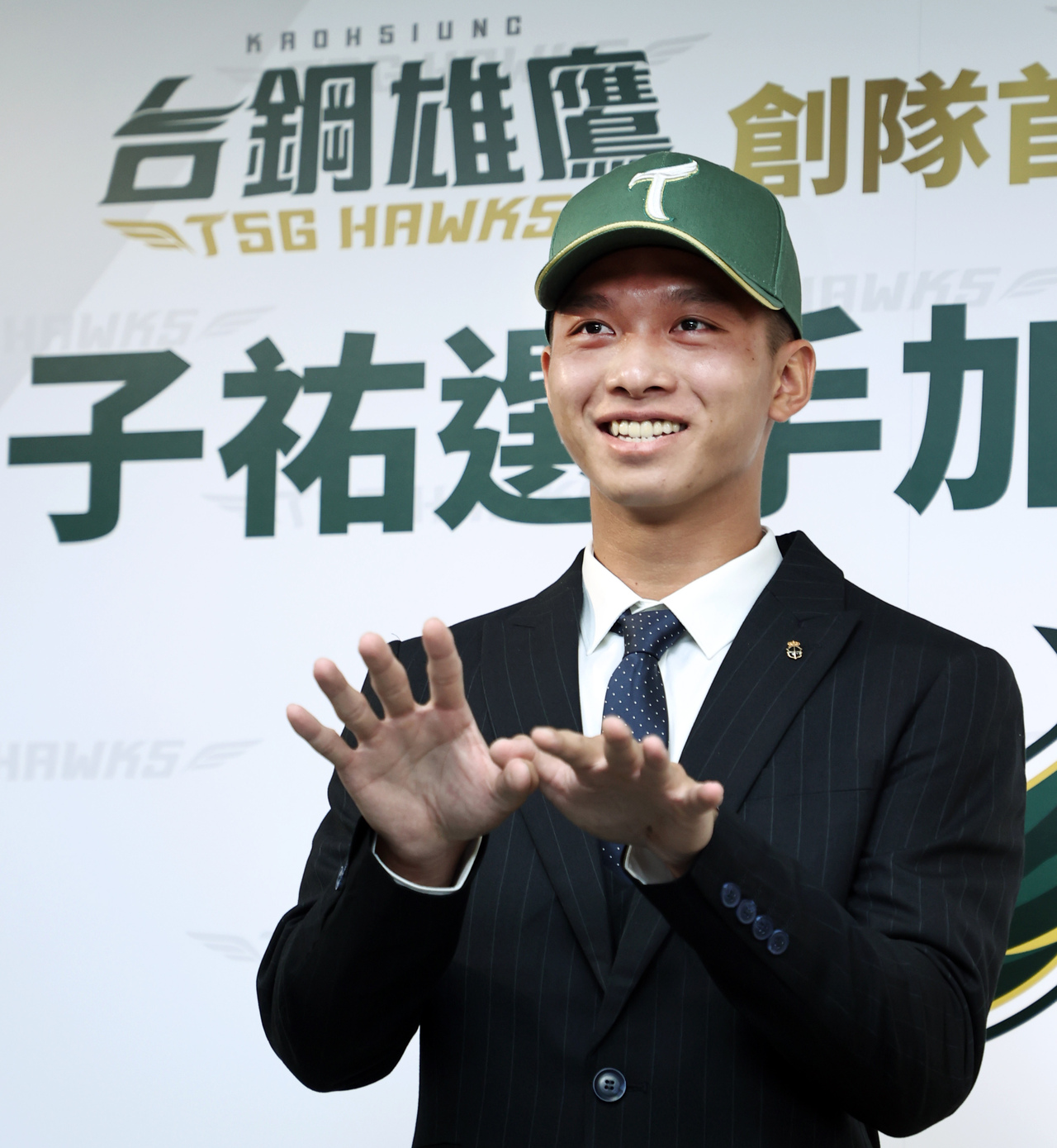 選秀狀元曾子祐昨天在加盟台鋼雄鷹記者會中,靦腆比出雄鷹飛翔手勢。