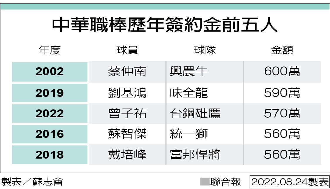 標題[聯合] 曾子祐簽約總值710萬 簽約金史上第3高