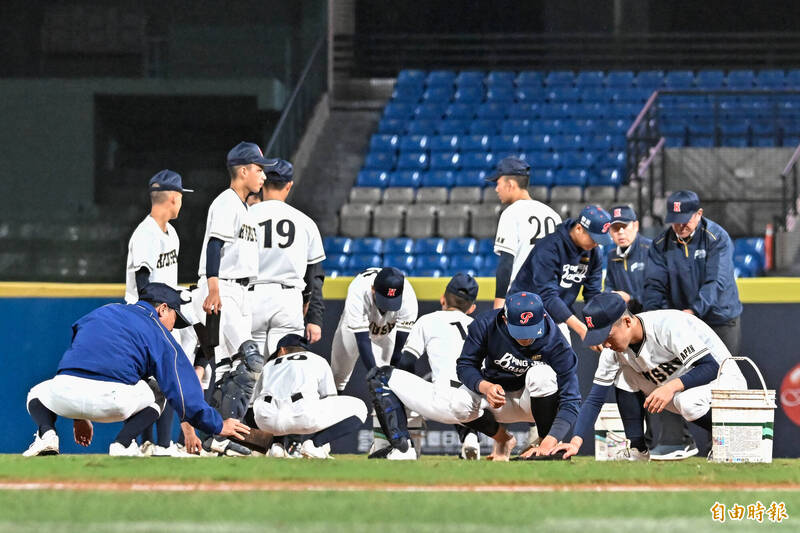 原定晚上6點半開打的平鎮高中對九州聯隊之戰,也延至7點進行,賽前平鎮和九州聯隊球