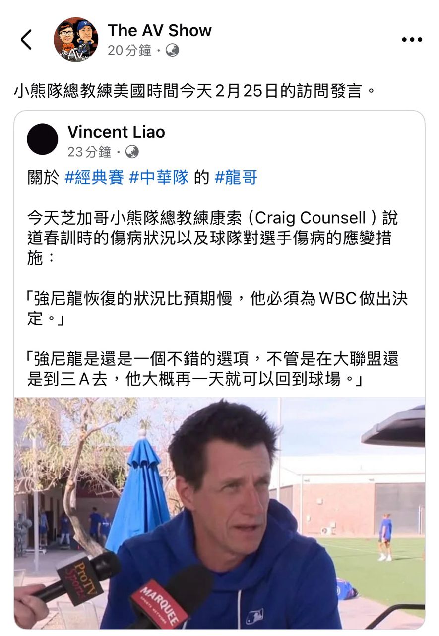 推 Tads: 新聞有出來了 小熊總教練意思是他隨時有可能上大聯盟 叫他 02/26 08:05