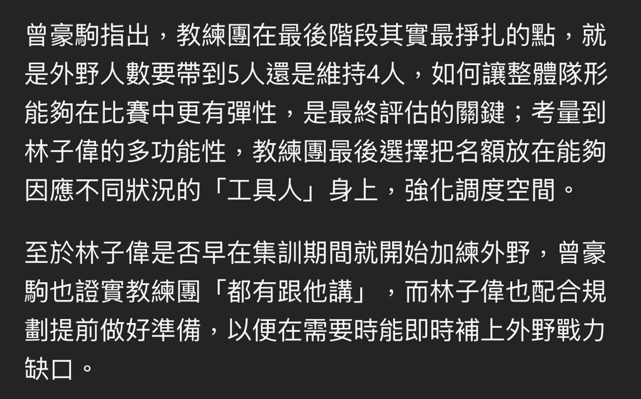 林現在的狀態只能守二壘,但張李鄭江吳都能夠守還不只二壘,反倒現在板凳缺代打,五