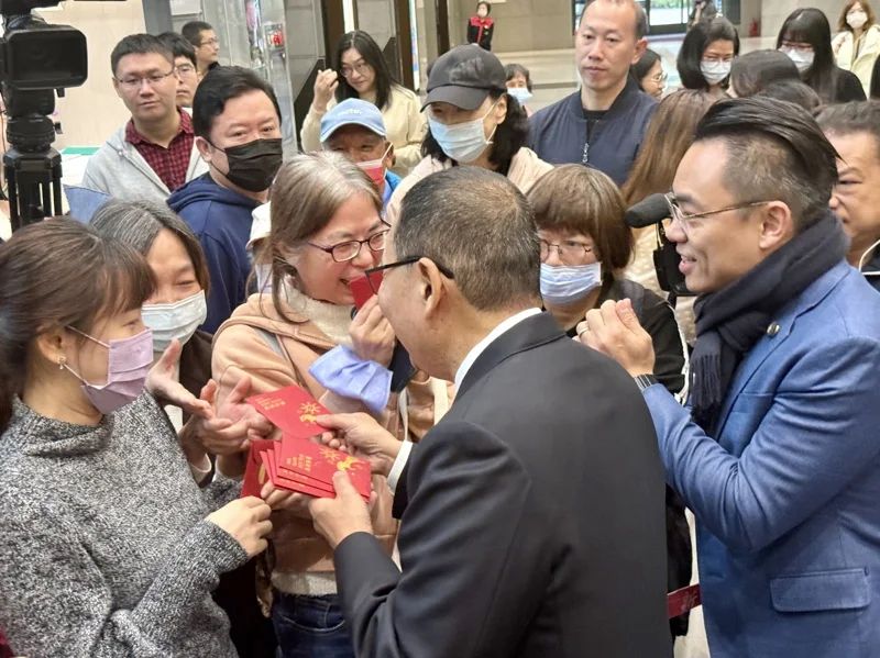 新北市長侯友宜(前)會後發放新春福袋給現場民眾。記者張策/攝影