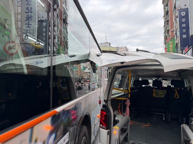 準備要接運的長照車,公車的車身卡到後車門,結果造成兩車發生碰撞車禍,導致現場交