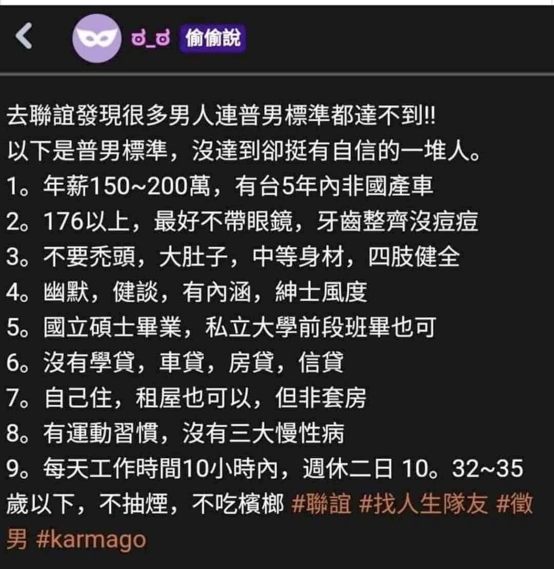 → pansquarl : 什麼,台灣女生要求有這麼低嗎,我以為是年收百萬 02/09 17:43
