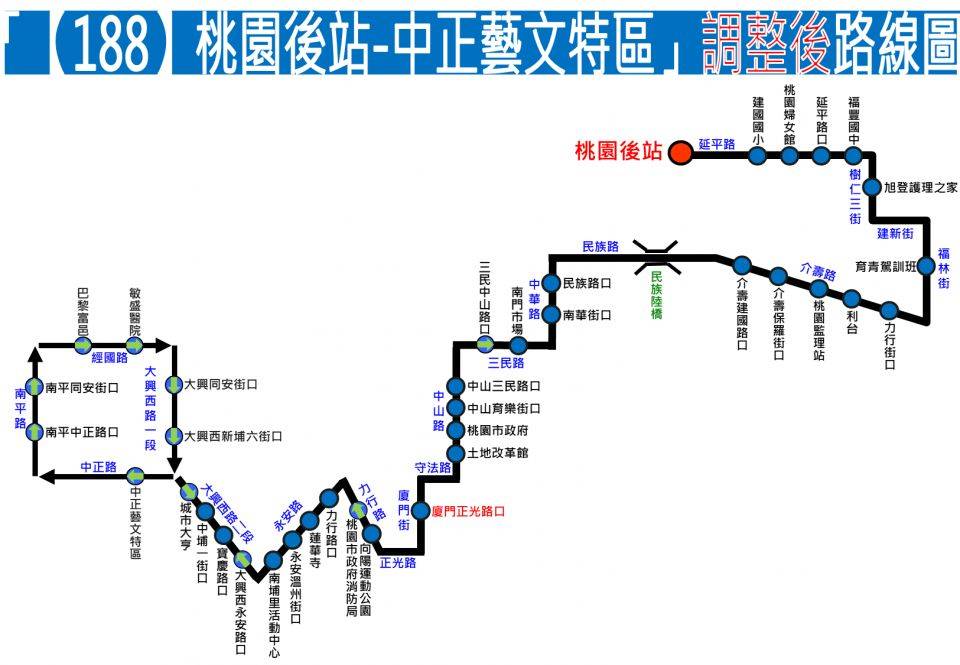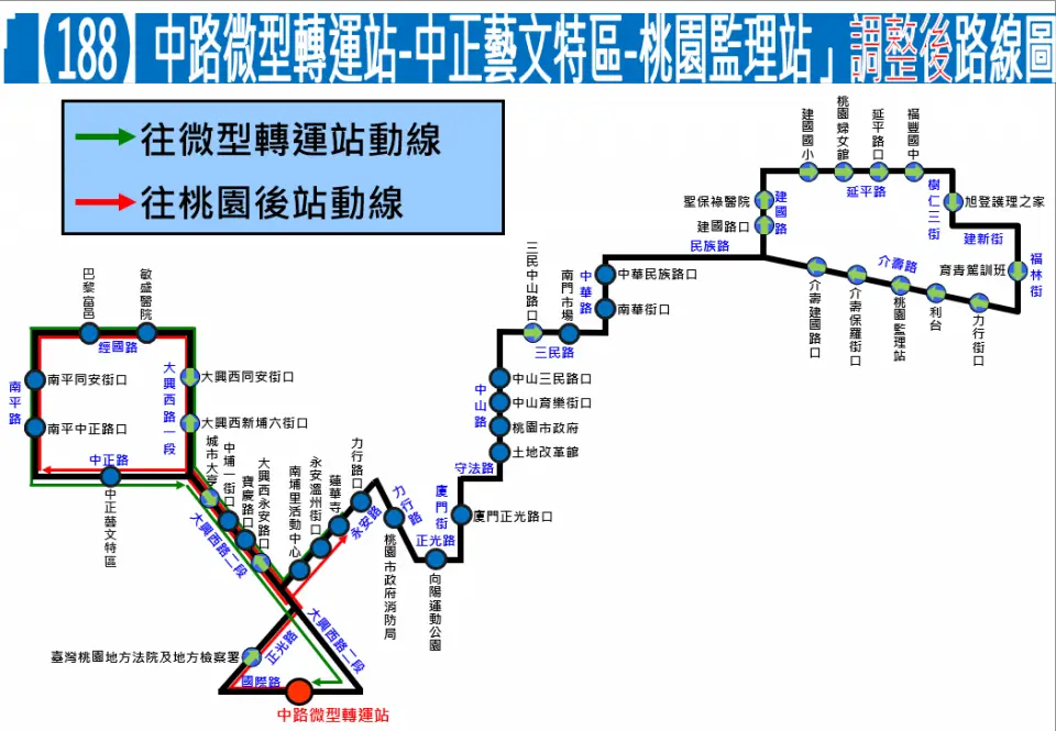 新增之9條路線中,【188】路線配合端點調整,從「桃園後站」調整至「中路微型轉運站