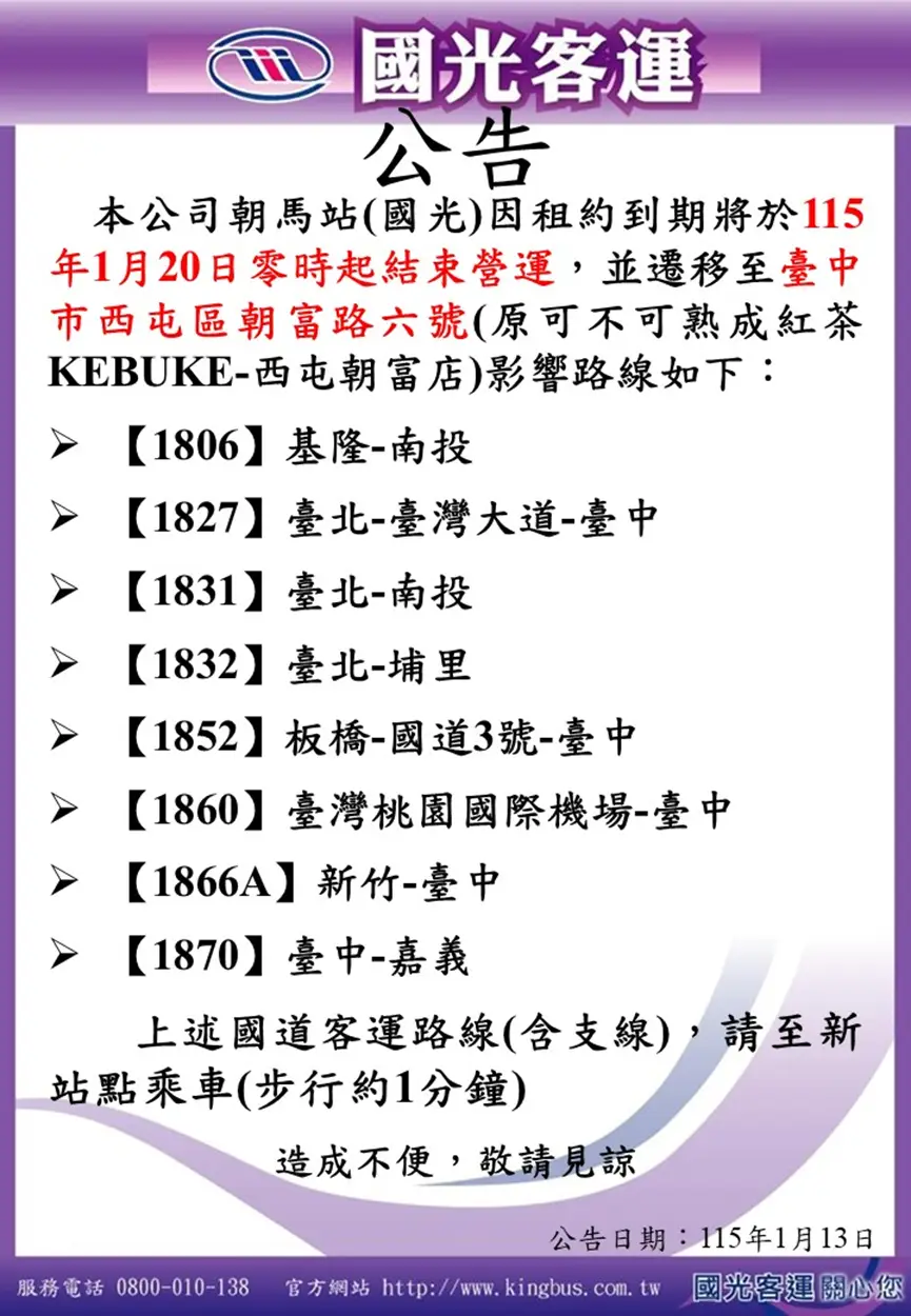 本公司朝馬站因租約到期,將於115年1月20日零時起結束營運,並遷移據點營運
