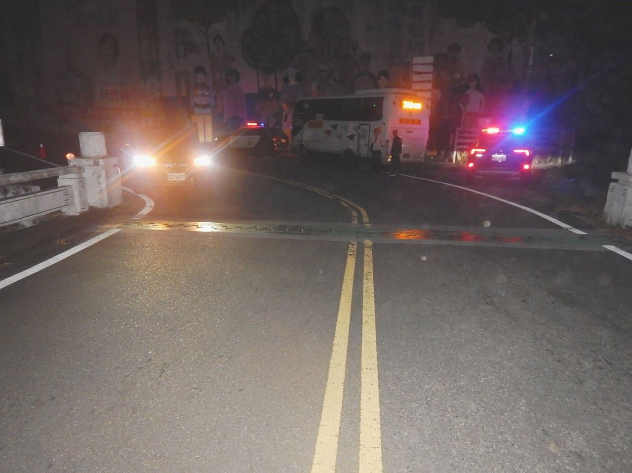 道路路段,過彎時跨越雙黃線,不慎與自用車擦撞,無人員傷亡,並已報警處理。