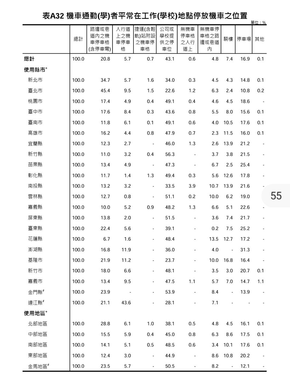 推 kutkin: 表A32 機車在工作學校地只有8.4%停人行道車格 04/25 09:06