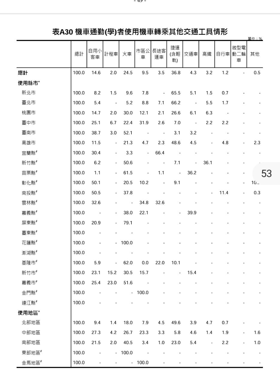 → kutkin: 表A30 機車31.9%轉公車 25.1%小客車 22.4%火車 04/25 09:04