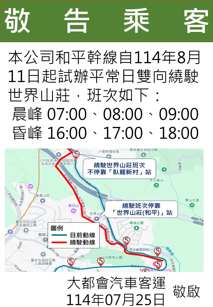 2. 繞駛班次取消「臥龍新村」站位,新增「世界山莊(和平)」站位