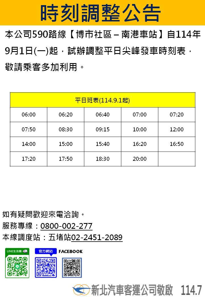 營運路線 590 博市社區—南港車站