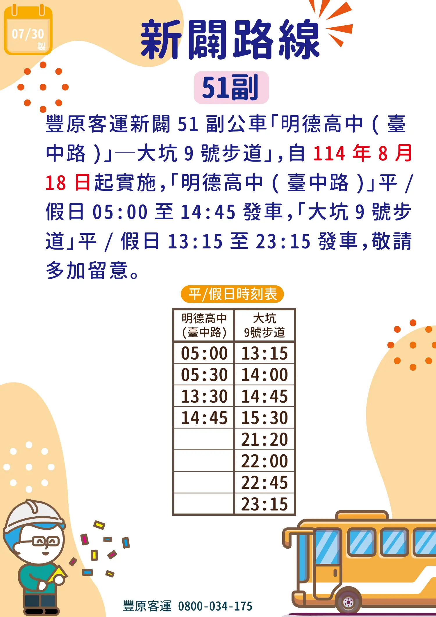 豐原客運新闢 51副 公車路線,由明德高中(台中路)、大坑9號步道雙向發車