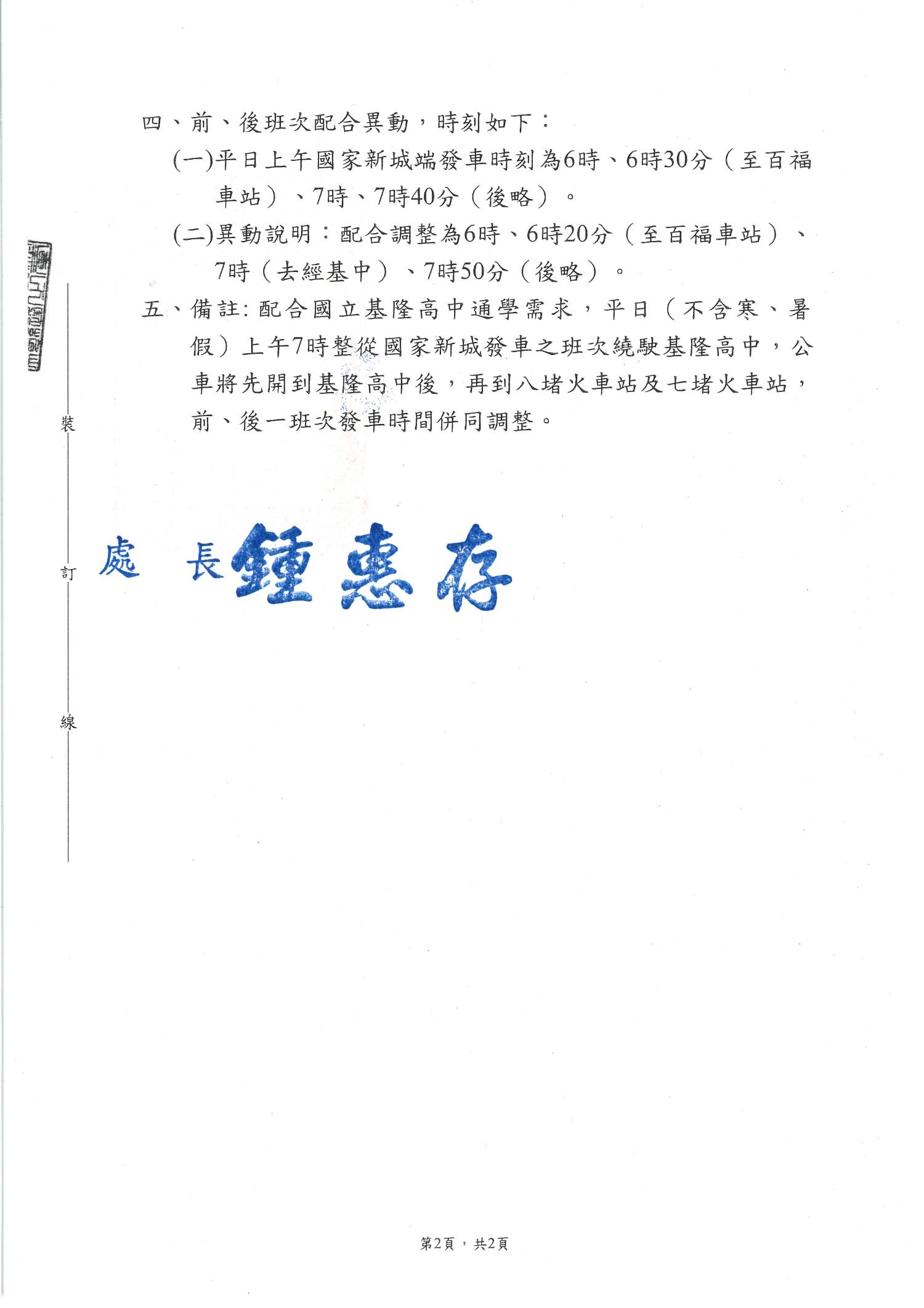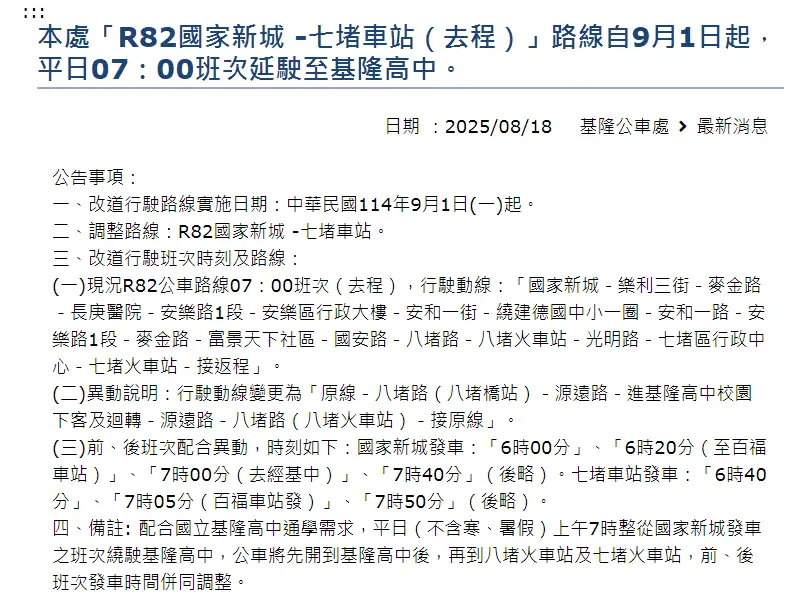 1. 平常日 國家新城 07:00 班次:往七堵車站方向新增繞駛基隆高中