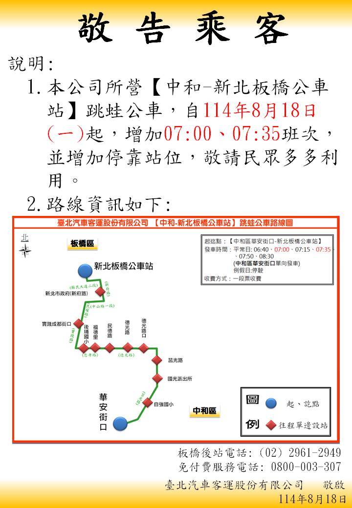■ 本路線由(中和)華安街口發車,僅往板橋單向行駛