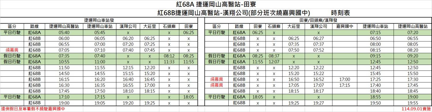 1055 1100 X X 1133 1155止 紅68A 假日行駛