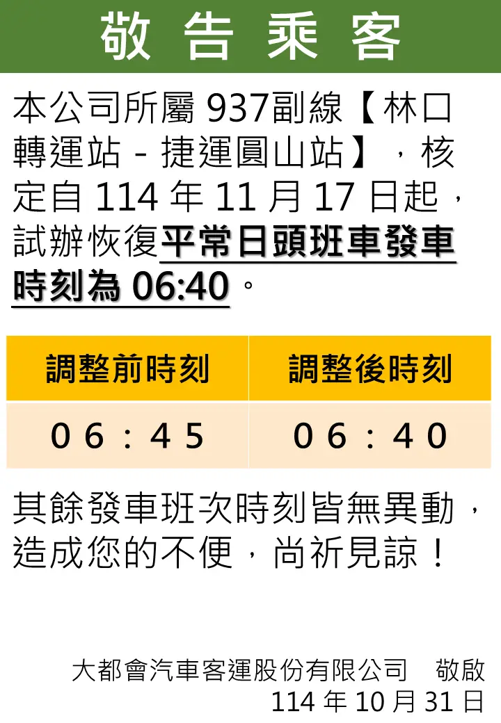 (本次調整後將恢復原始發車時間)