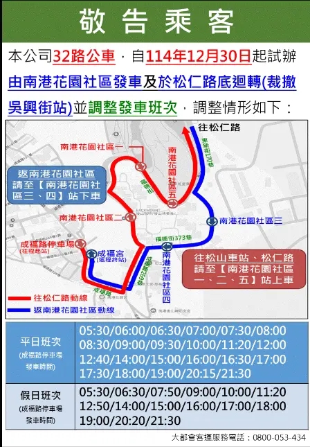. 南港花園社區一、二、五改為往程(往松仁路)停靠