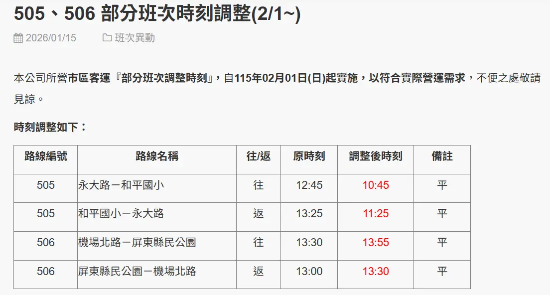 和平國小 13:25 班次調整為 11:25 發車