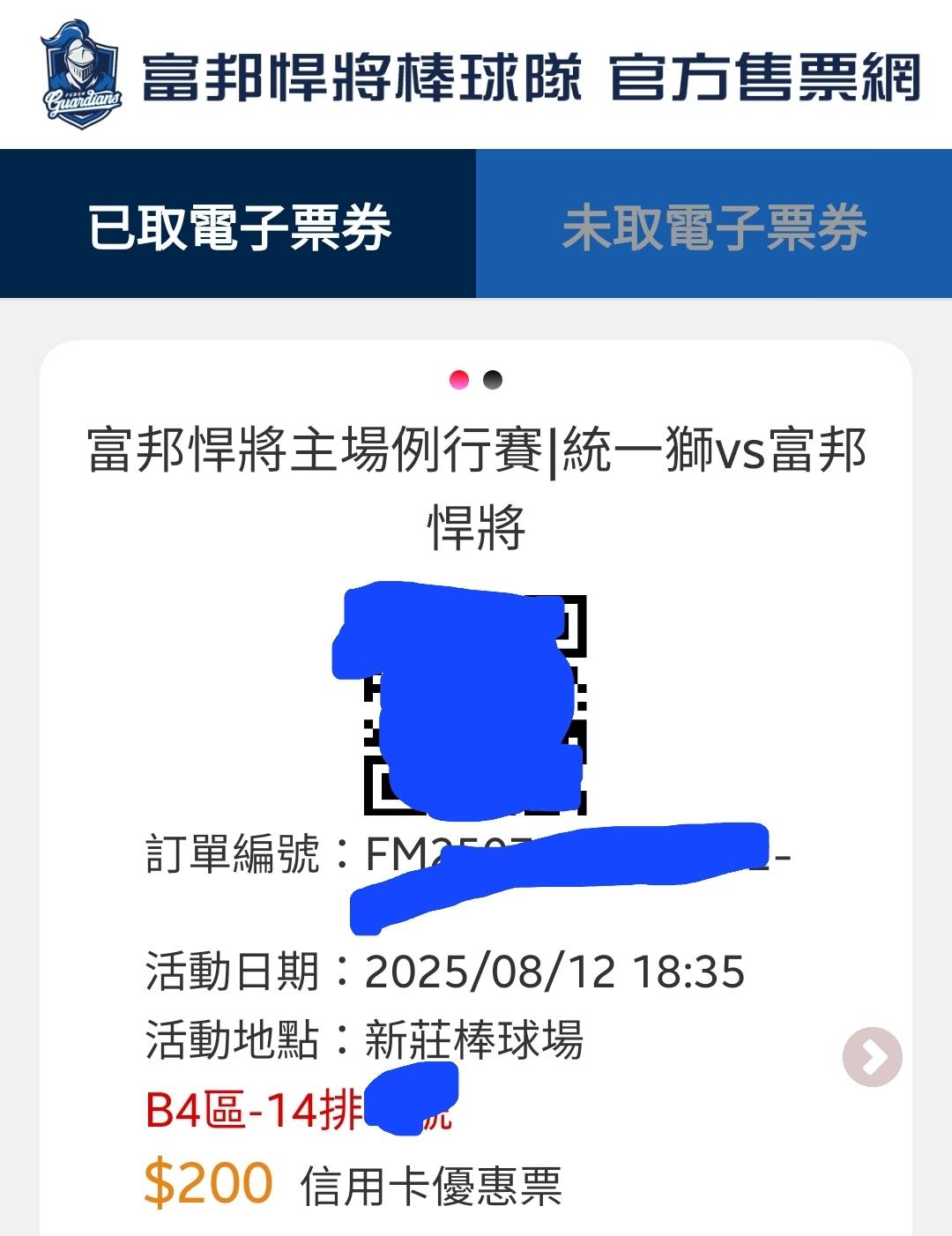 標題[賣票] 8/12 統一vs富邦 B4-2連號 信用卡優惠
