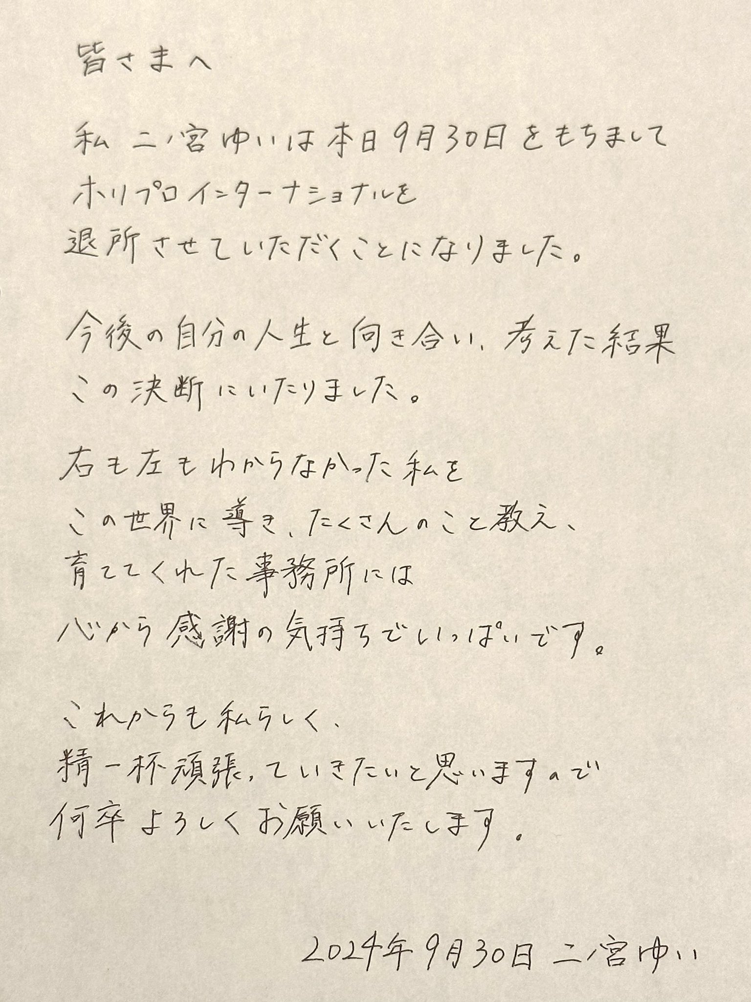 この度、弊社所属の二ノ宮ゆいは2024年9月30日をもちまして、