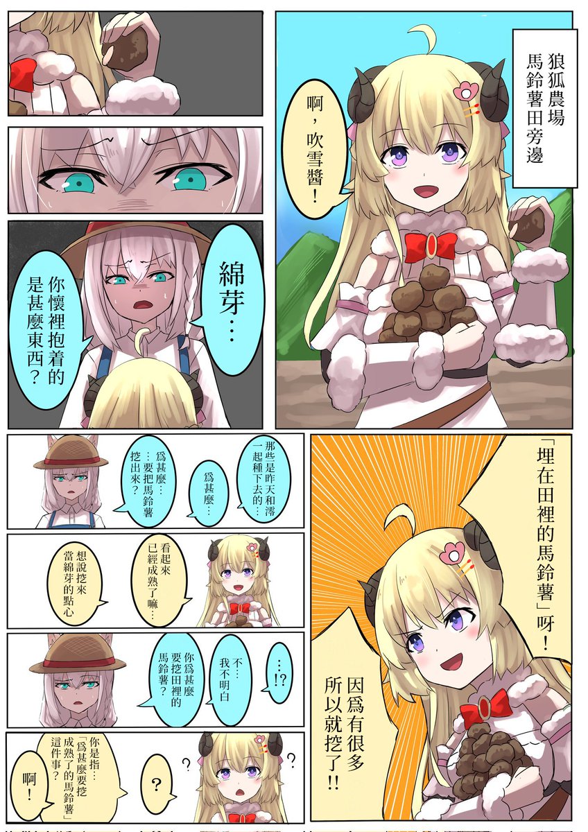 在狼狐農場的馬鈴薯田旁邊,吹雪遇到了手上抱著一堆馬鈴薯的綿芽