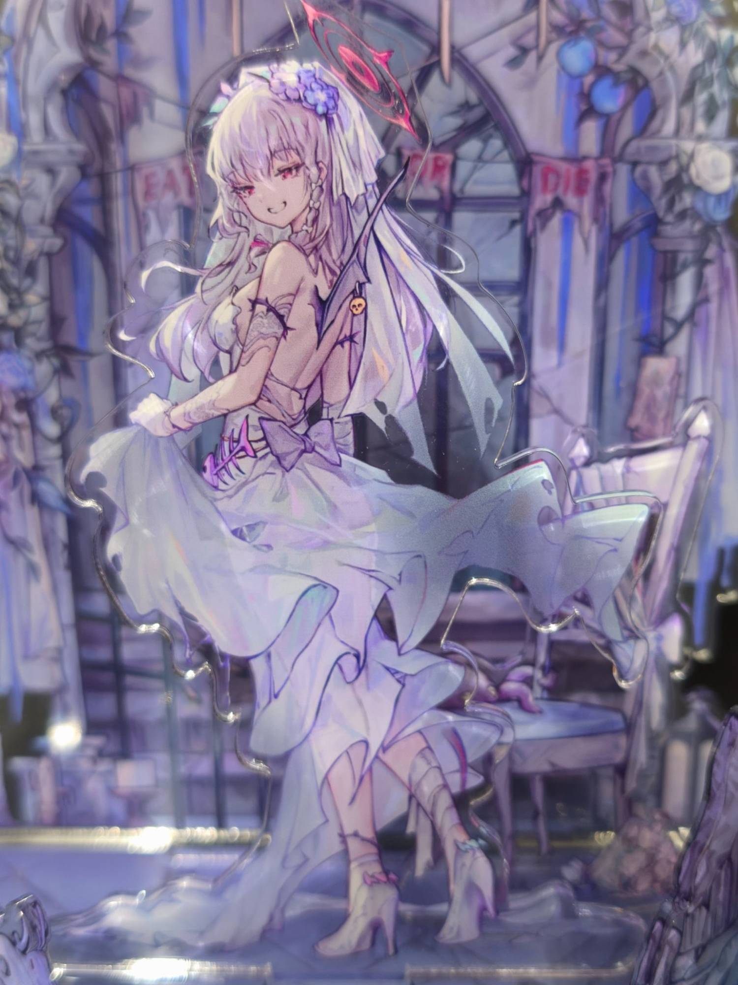 整體(帶一點萬聖元素?的婚紗立牌),前方有一隻骷髏狗和斷裂的柱子