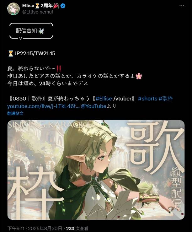 標題[Vtub] Ellise 歌回 夏が終わっちゃう #shorts #歌枠