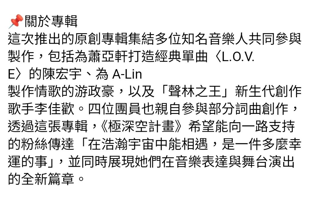 環球音樂臺灣董事總經理謝定原表示:「我們非常歡迎《極深空計畫》加入環球音樂的大