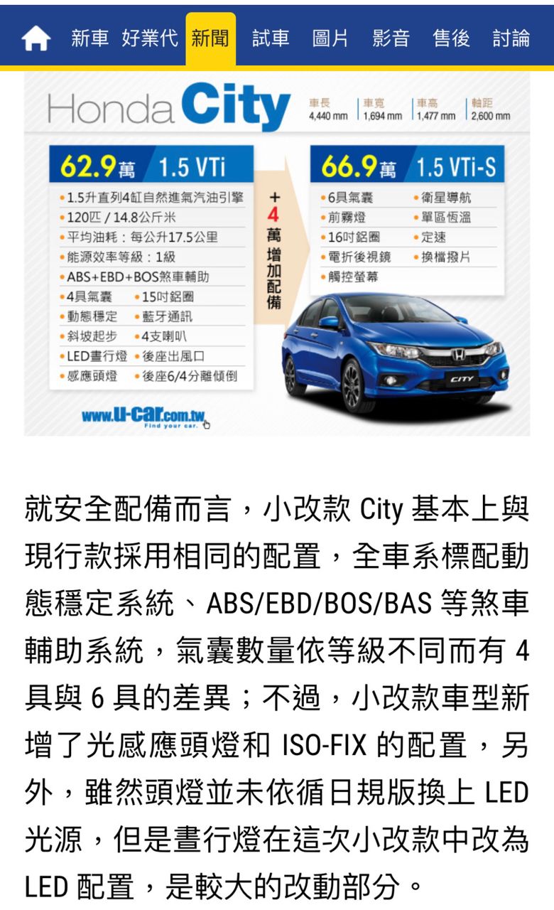 車款型式/排氣量:HONDA CITY 1.5 VTi-S/1497cc