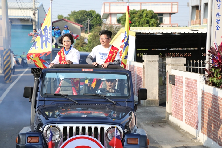 彰化縣議長謝典林(右)與母親、前立法委員鄭汝芬(左)一同站上宣傳車,走訪基層鄉鎮。母子同台展現堅定的公共服務信念與世代傳承的政治熱情,象徵地方深耕與家族政治能量的延續。