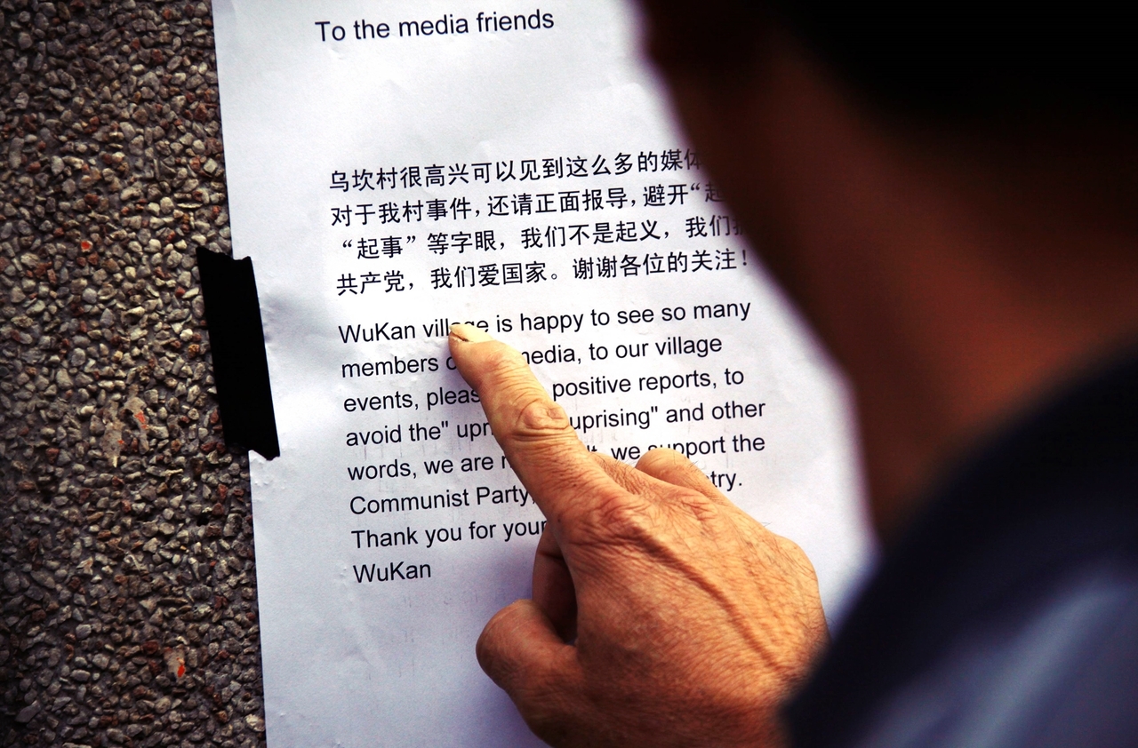 烏坎抗爭期間,村內張貼著一張寫著給媒體的敬告紙。圖/路透社