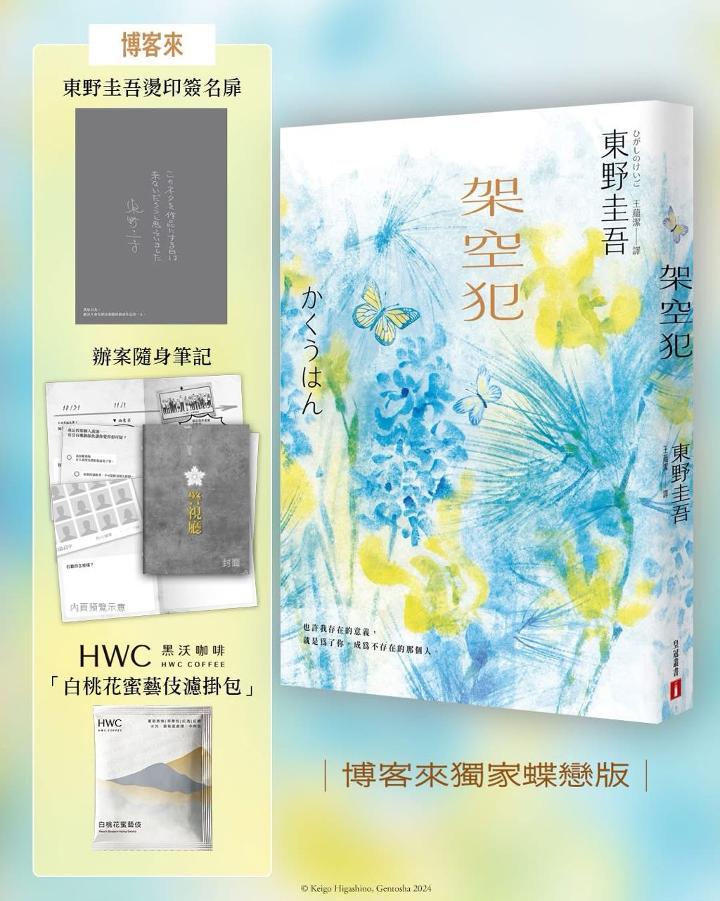 的限量預購贈品,包括HWC黑沃咖啡「白桃花蜜藝伎」濾掛咖啡包,讓讀者在咖啡香氣中