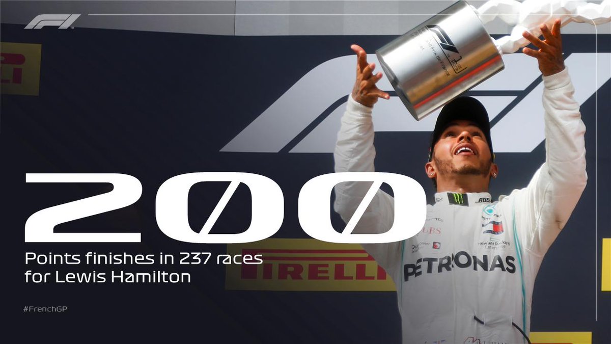 Lewis Hamilton F1生涯的237場比賽中, 有200場比賽獲得分數完賽, 比例是F1最高的84%。