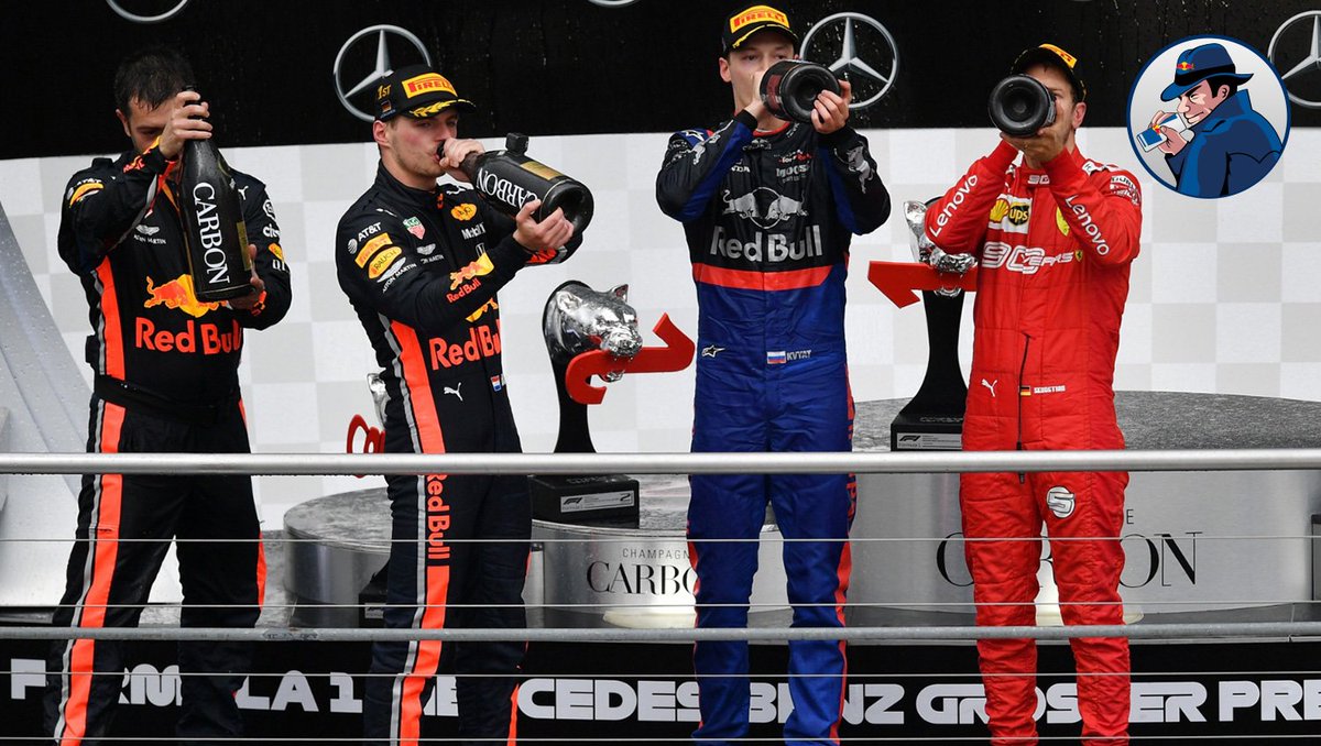 Daniil Kvyat幫助Toro Rosso小牛車隊 在德國GP獲得隊史上第二次頒獎台, 左摟右抱的真是令人稱羨(X), 喜出望外的歡笑是最珍貴的(O),恭喜小牛! 上一次頒獎台是2008年義大利GP由Vettel 駕駛STR3獲得分站冠軍, 這也是他的第一冠與第一個桿位。