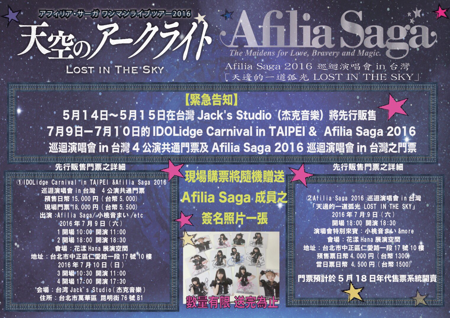 (1 heart)現場購票將隨機贈送Afilia Saga 成員之簽名照片一張(1 heart)台灣的前輩你