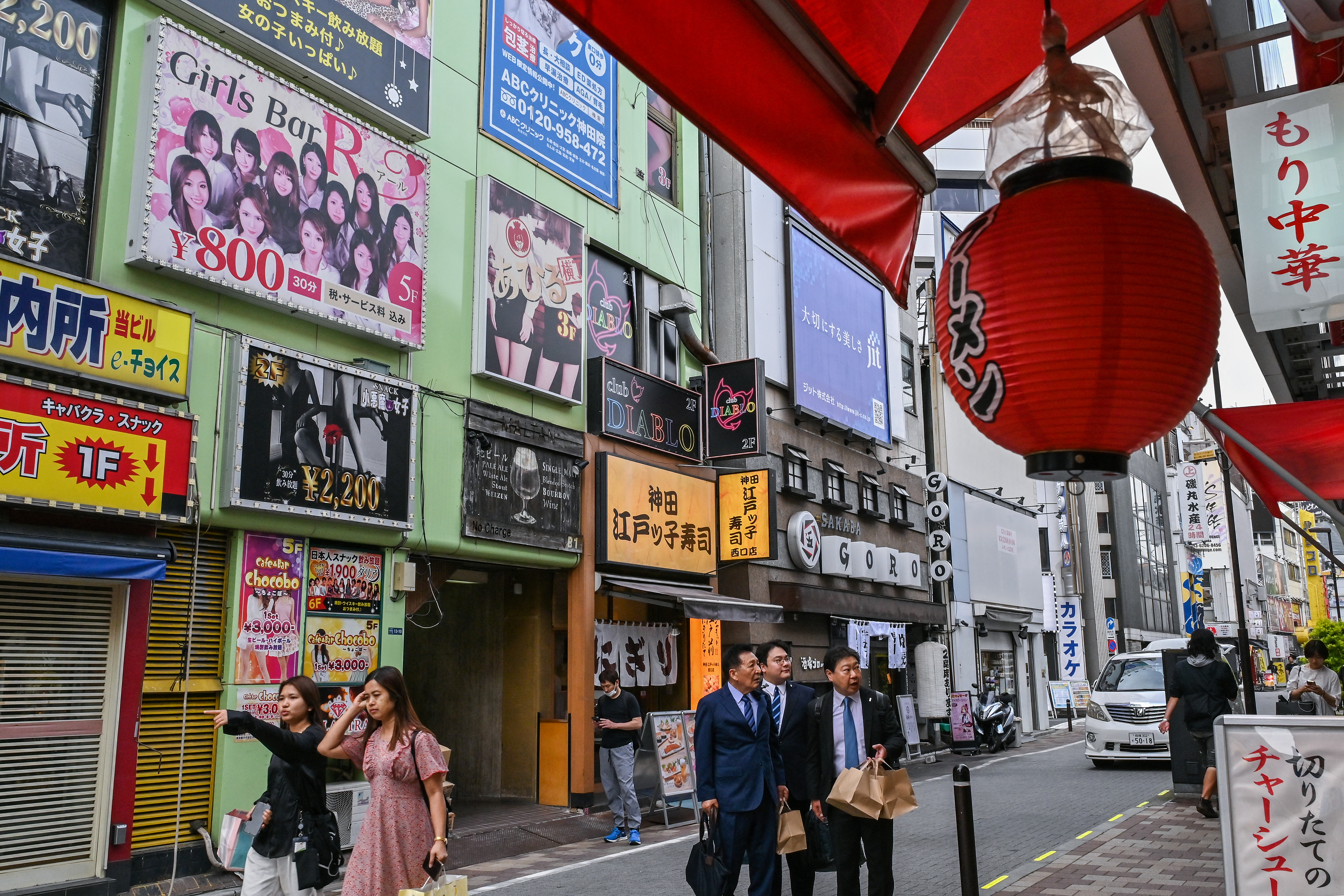 2024年5月23日,人們走過東京市中心神田(Kanda)車站外的酒吧、餐廳和娛樂場所。