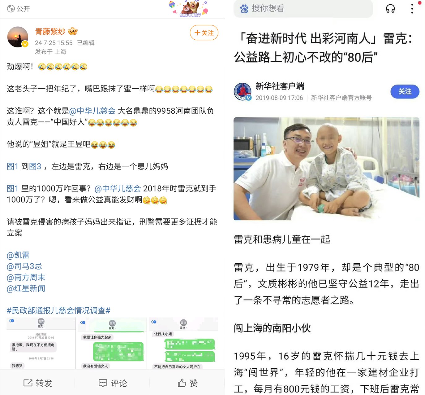 近日,有大V在社交媒體上爆料中華兒慈會河南負責人、9958志願者雷克哄騙患病孩子媽