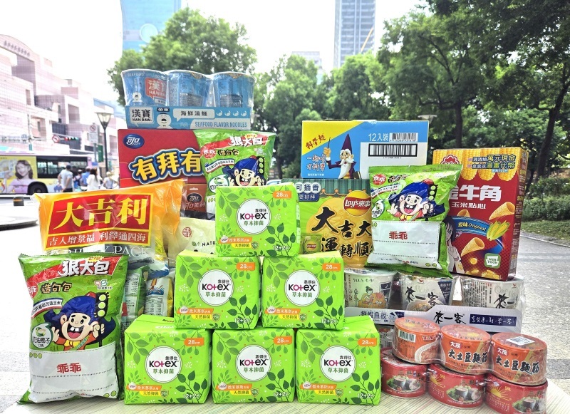 泡麵、罐頭,也有一些「特殊品」讓旁觀者會心一笑,例如綠色包裝的「乖乖」,以及跳