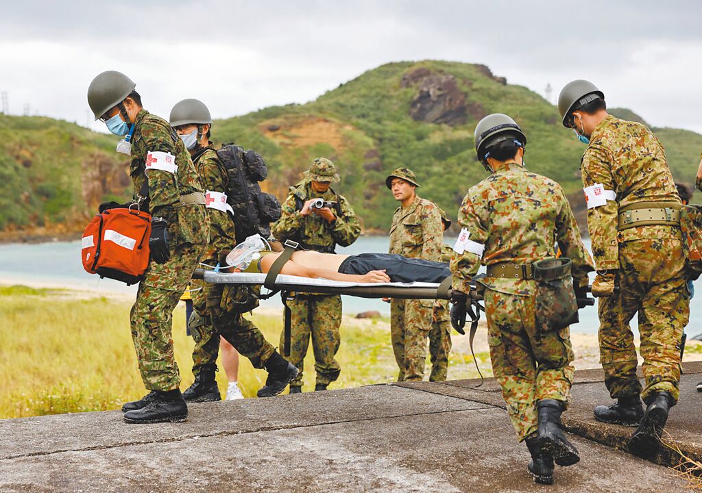 日本自衛隊士兵在沖繩縣與那國島參加疏散演習。(路透)