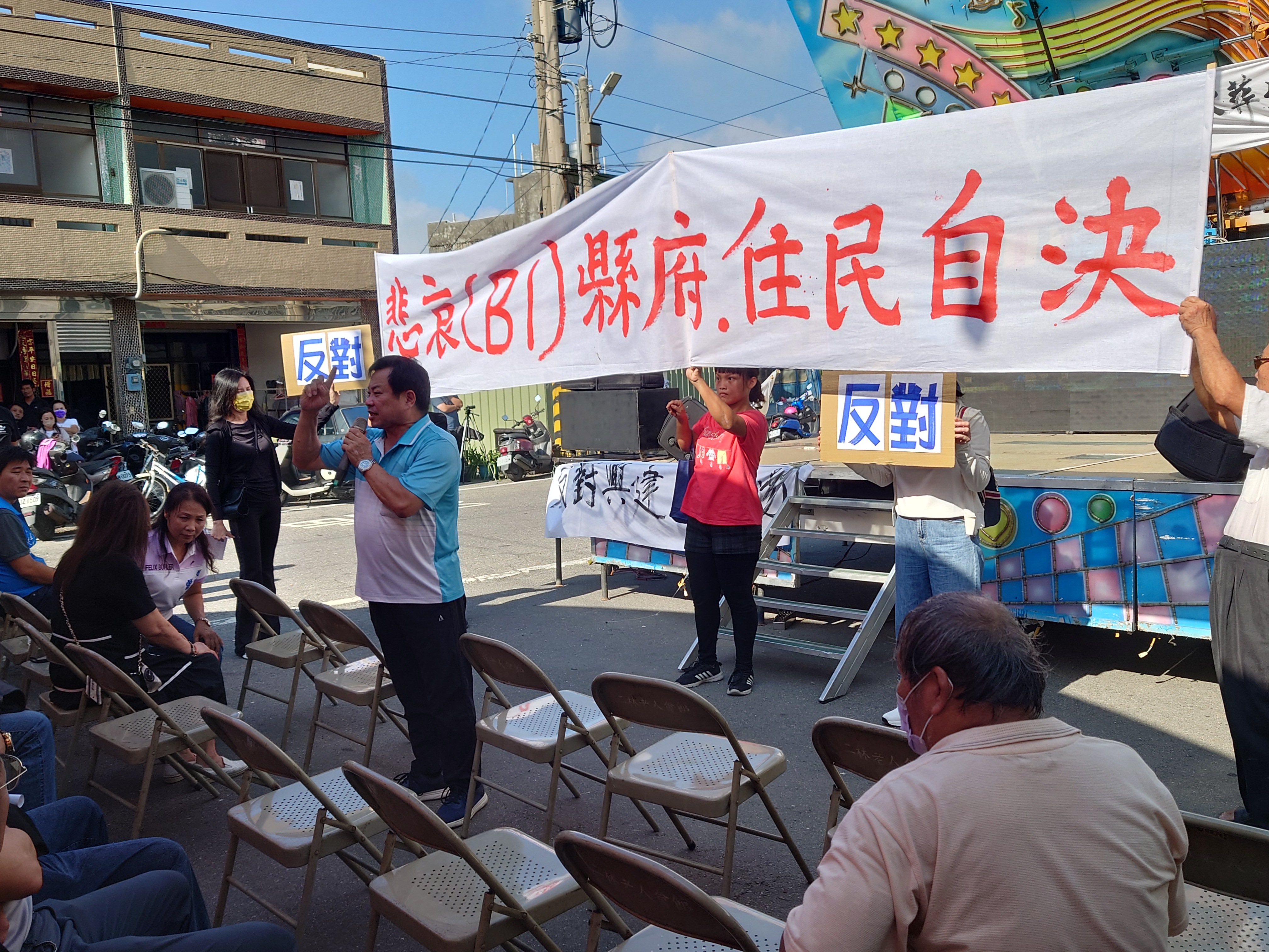 彰化縣二林鎮趙甲里反對建設火葬場自救說明會拉白布條抗議,縣議員張國棟是前鎮長,