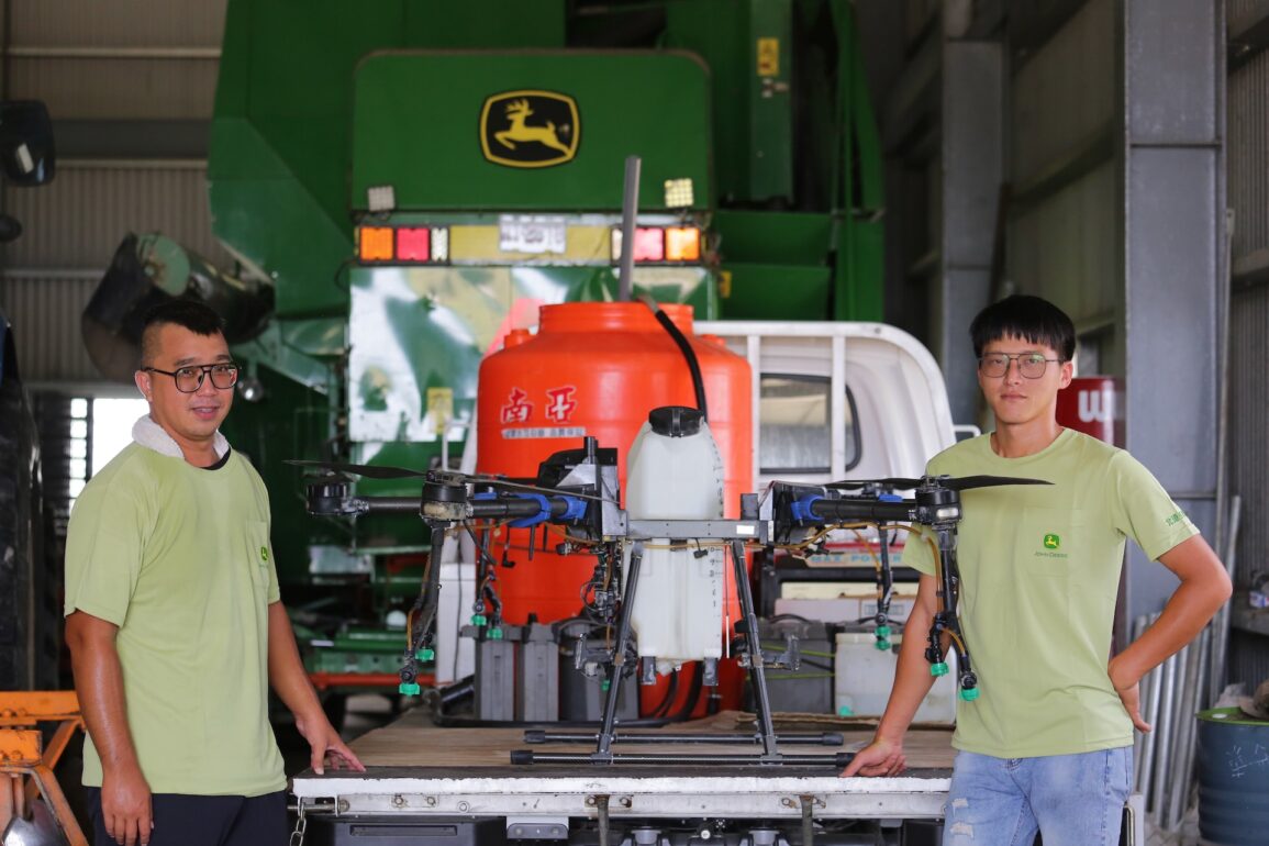 台南市官田青農陳鴻偉今年也添購無人機,加入代耕行列。陳鴻偉種有 12 公頃水稻,「