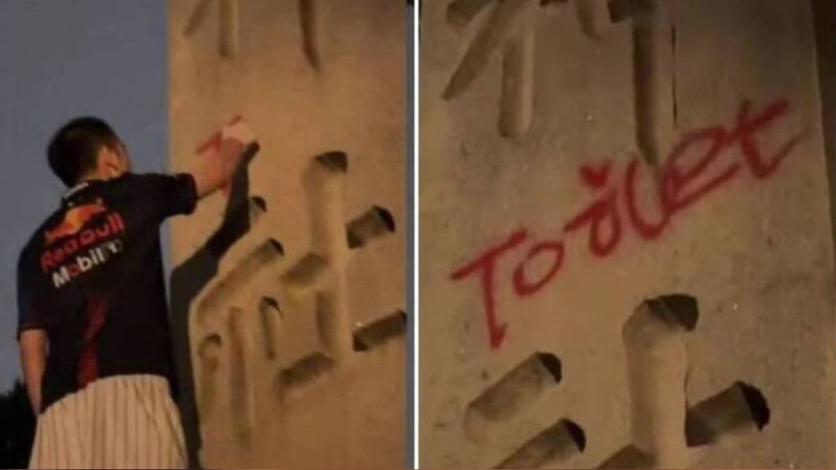 姜卓君5月在靖國神社石柱上用紅色噴漆寫下英文「Toilet(廁所)」、「狗屎」、「去死