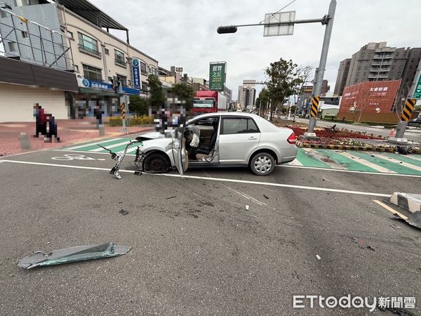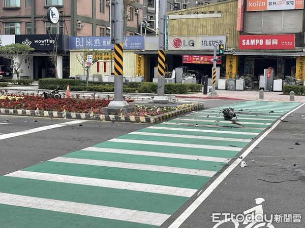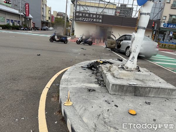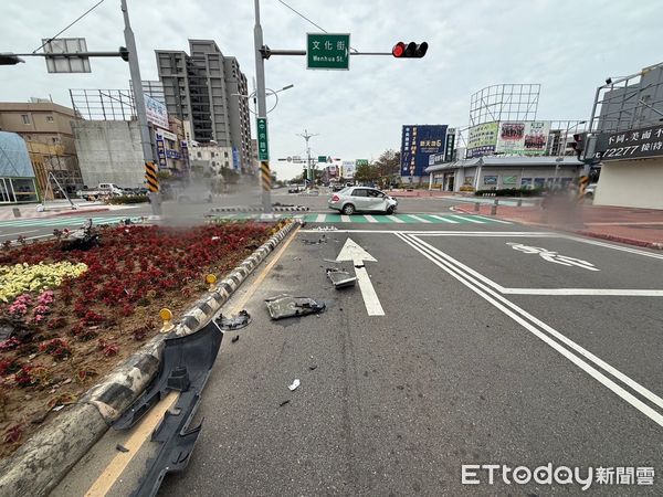 行,一時恍神,不慎碰撞分隔島致車頭全毀,整顆引擎也斷成兩截噴出到斑馬線和分隔島