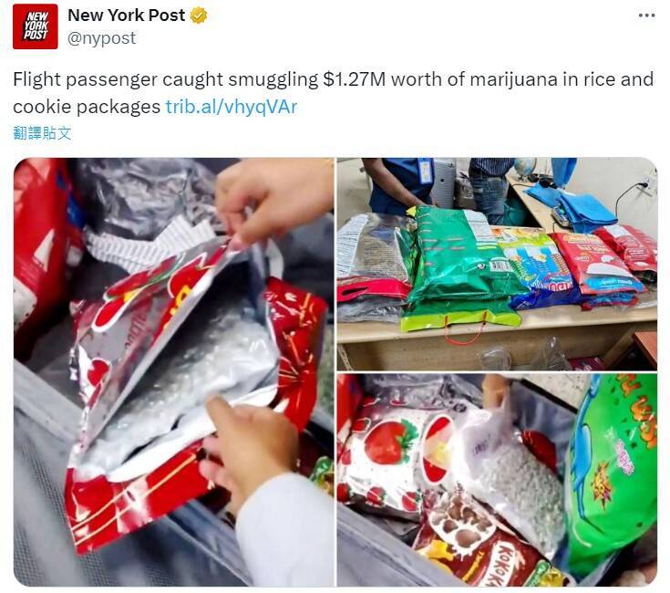 ,遭海關攔查發現行李內8包標示餅乾、大米包裝之中,藏有價值超過130萬美元(約新台